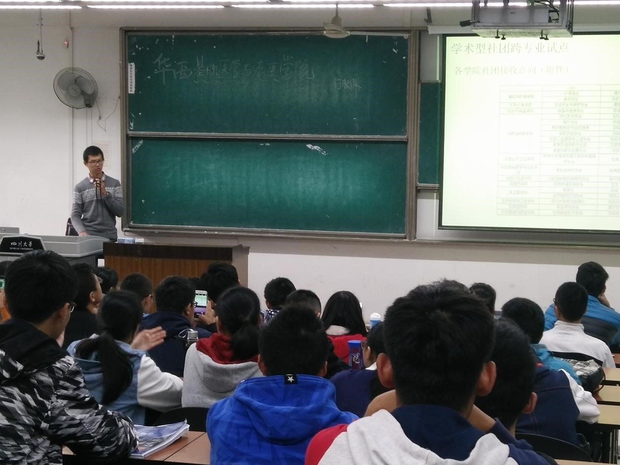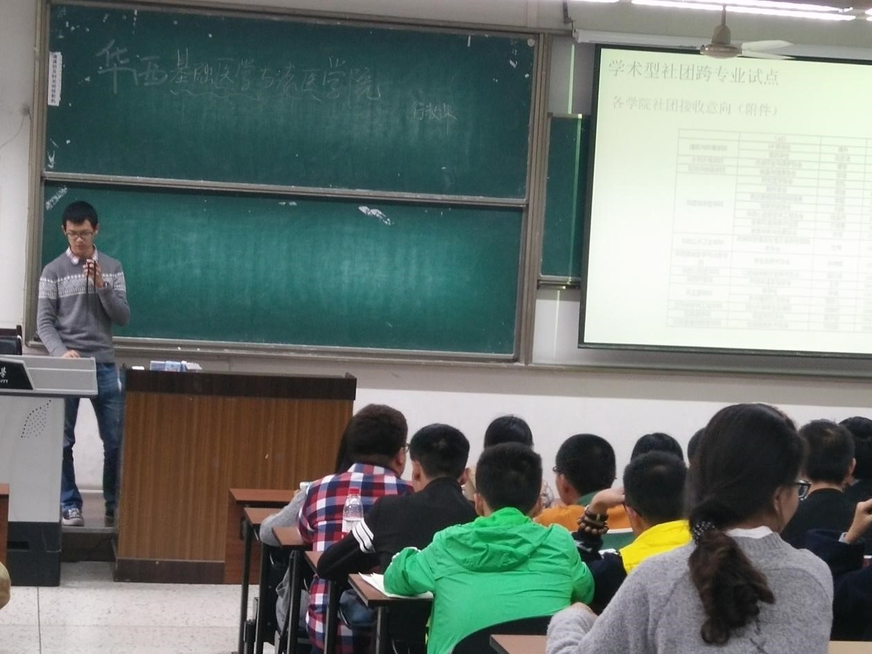 2016年11月5日下午二时,华西基础医学与法医学院在四川大学江安校区一教b座102教室召开了筹备已久的大创宣讲会暨跨专业社团试点宣讲会。本次活动由基法学院社团工作部部长,跨专业试点社团负责人,16级全体学生共同参与。