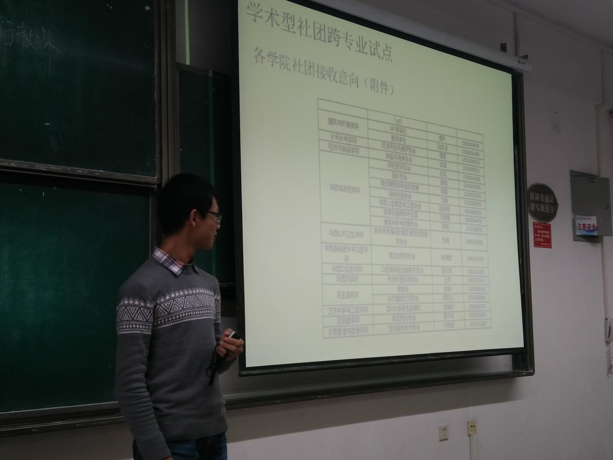 主持人简要开场过后,学院社团工作部部长为大家详细讲述了近期学院社团的发展状况以及接下来的活动预告和工作部署重点。随后,到了同学们最关注的部分,即学院跨专业社团试点的开展情况。社团负责人向大家讲解了跨专业试点的由来,实行的目的,以及上一学年在华西临床医学院的试点情况;接着,负责人联系四川大学学生社团联合会官方网站上的解读和相关附件,结合图表,为大家详细讲述了各学院开展跨专业试点的主要社团,申请加入所需的条件以及如何进行申请。同学们认真听讲,仔细记录,并根据自身条件进行了分析。