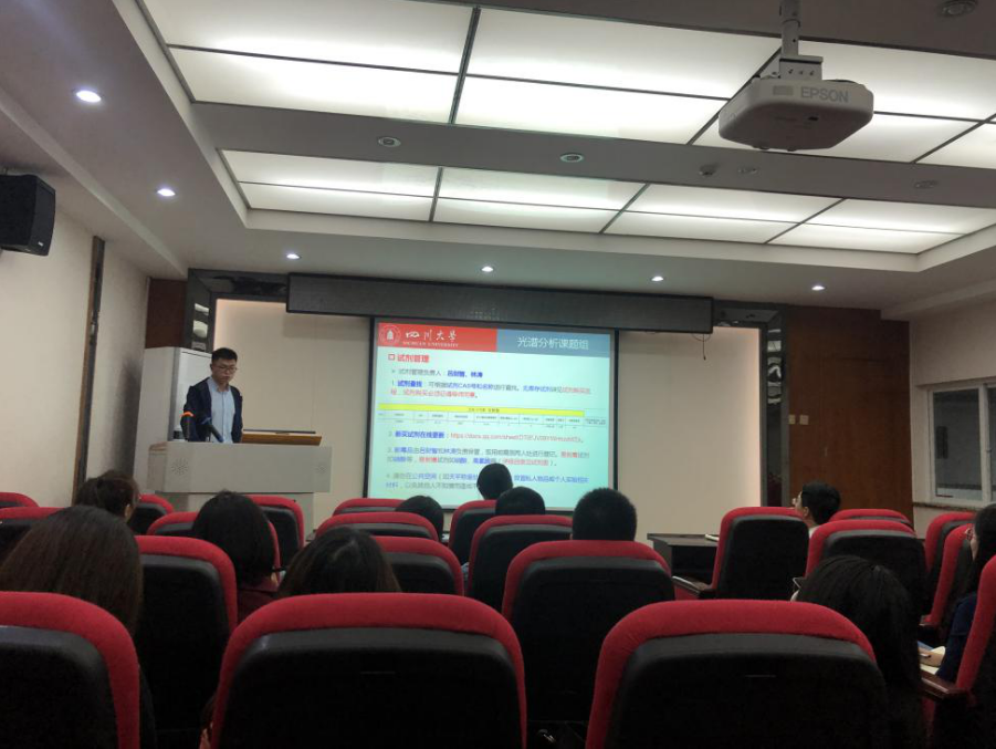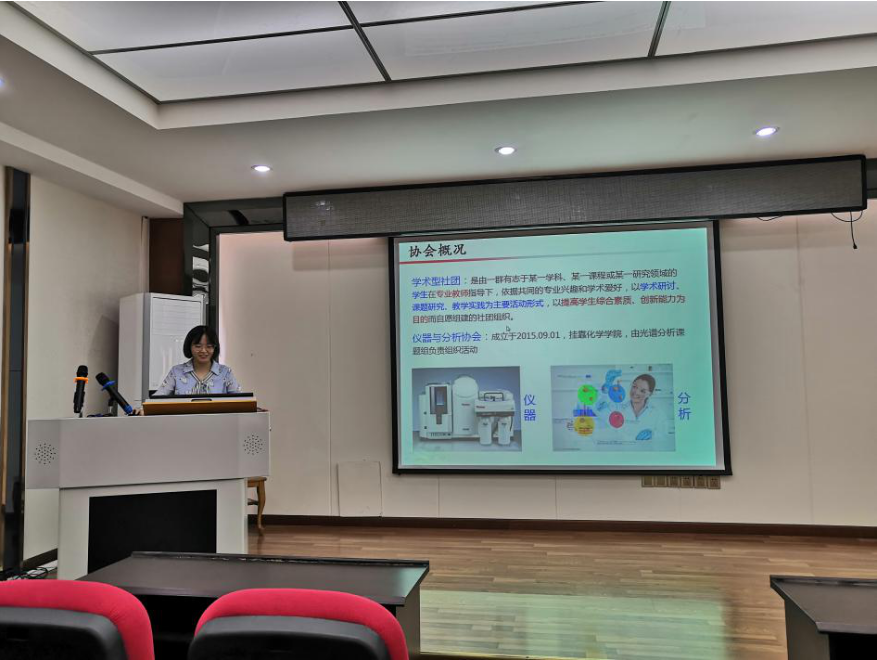 会长何昱静首先代表协会欢迎了各位成员的加入与到来,并简要介绍了“仪器与分析”协会概况:仪器与分析协会成立于2015.9.1,挂靠化学学院,由光谱分析课题组负责组织活动,协会指导老师包括侯贤灯教授、郑成斌教授、蒋小明副研究员等老师,协会致力于为热爱仪器分析领域的同学们创造提供一个良好的学术交流氛围。随后副会长胡昌佳介绍了协会拟开展的相关活动,并通过分享课题组迎新晚会照片及一些日常照片,让大家体会到了课题组及协会其乐融融的氛围。随后研究生代表林涛简要介绍了课题组试剂管理等事宜,帮助提前进入实验室的成员们熟悉流程。