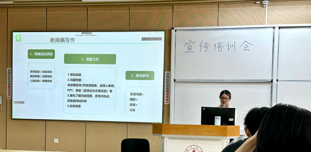 来自校团委宣传部新闻通讯部的同学介绍了新闻稿撰写的要求与技巧,细心地讲解新闻稿写作中的敏感词和注意事项 , 并分享了新闻摄影的相关要点。