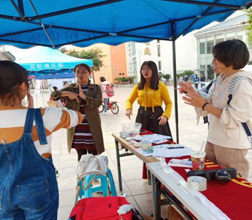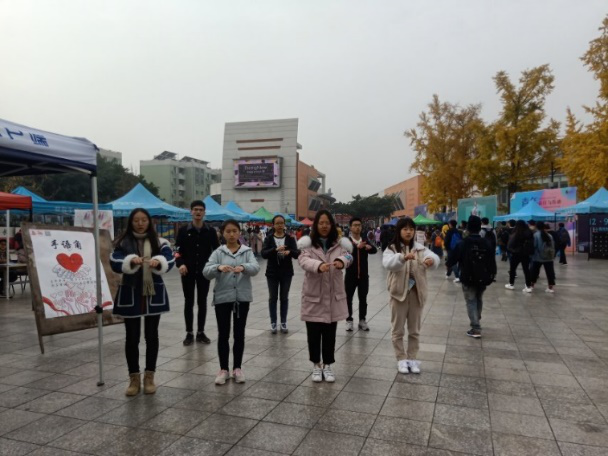 手语角是协会选择一些具有特殊意义的节日,在节日当天通过在青春广场摆摊的形式来传播正能量和爱心的一种活动。社团内部合理安排成员进行排班,摆摊内容主要为有趣的手语游戏和精美的明信片奖品。