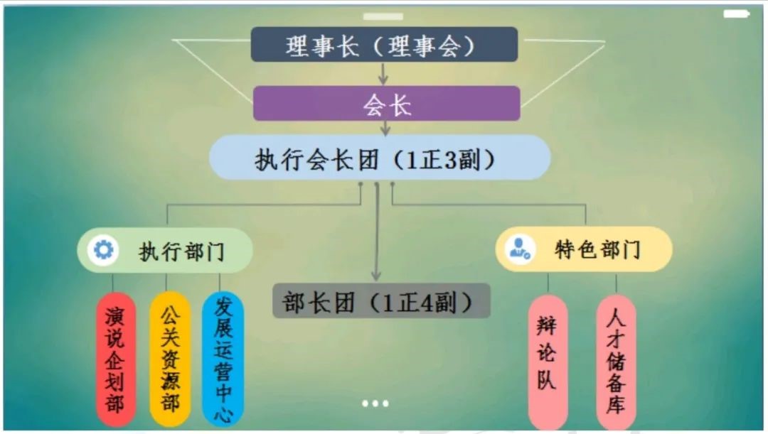 协会的组织架构精简高效,由社团理事会与干部团共同构成社团决策机构,同时下设三个社团执行部门:演说企划部、公关资源部、发展运营中心,另设有演协辩论队和人才储备库两大特色部门。