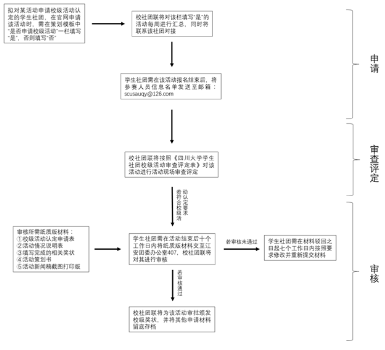(一)原则上社团活动须具备以下条件之一:该活动经校社团联审核,评定为年度学生社团精品活动或学术社团示范活动;该活动为四川大学学生社团文化节主题文化周的活动;社团自愿申报,经社团联审核,具备校级影响力的健康有益的其他活动;